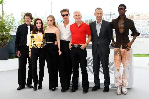 写真はカンヌ映画祭で映画プレスリー関係者が記念撮影したもの。左から2番目がプリシラ・プレスリーらしい。