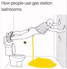 「公衆トイレの汚さがひどすぎる、一体全体どうやって使ったら、床がおしっこだらけで壁に足痕が残るんだろう」、ということで頭をひねって想像されたイメージ。